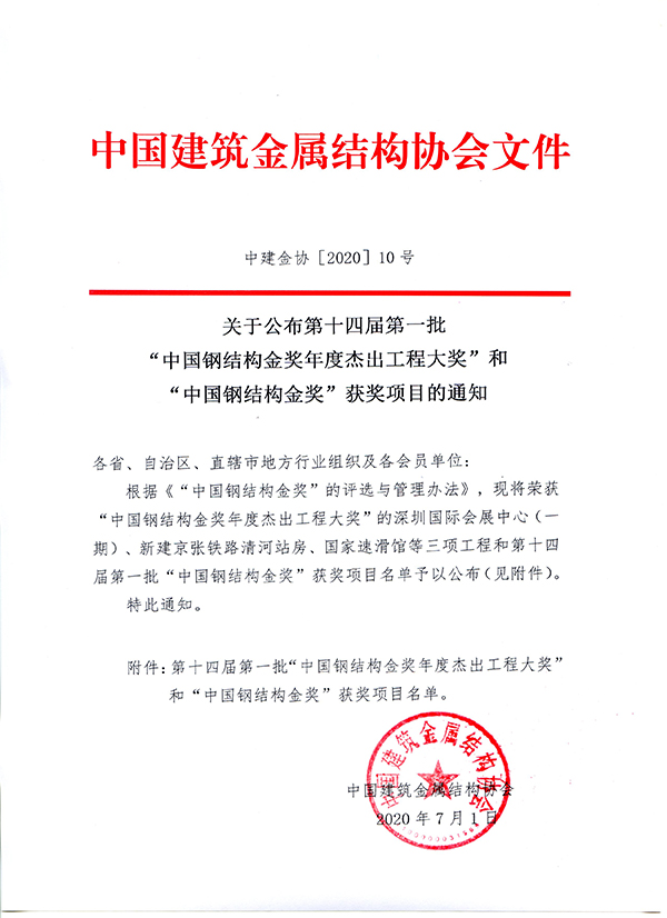 2020年7月1日,第十四屆第一批“中國鋼結構金獎”工程向社會公布,由鐵木辛柯設計、中天集團施工的龍湖·紫荊天街&紫金上城項目榮登榜單,且為獲獎項目中唯一的居住建筑項目。“中國鋼結構金獎”由中國建筑金屬結構協會組織評審,周期為兩年一屆,是我國鋼結構行業工程質量的最高榮譽獎。
