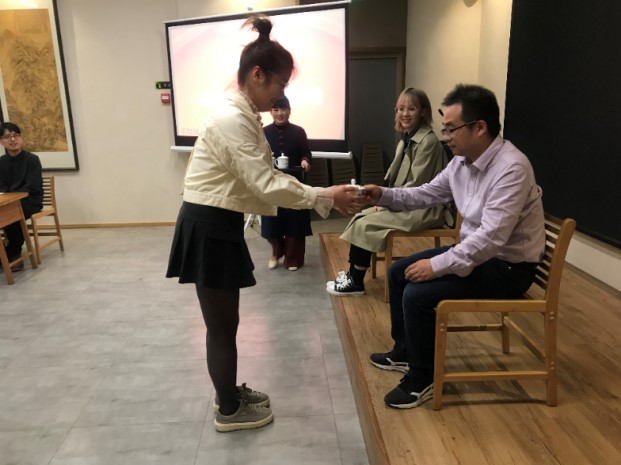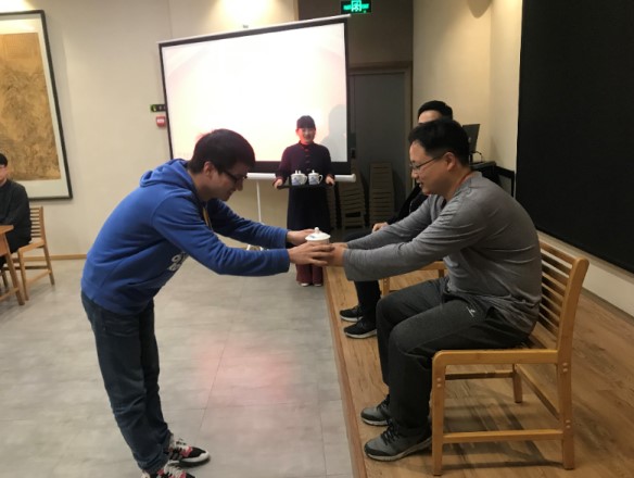接下來是敬茶環節,徒弟們為各自的師傅敬上一杯茶,同時師傅回贈徒弟書籍并合影留念。