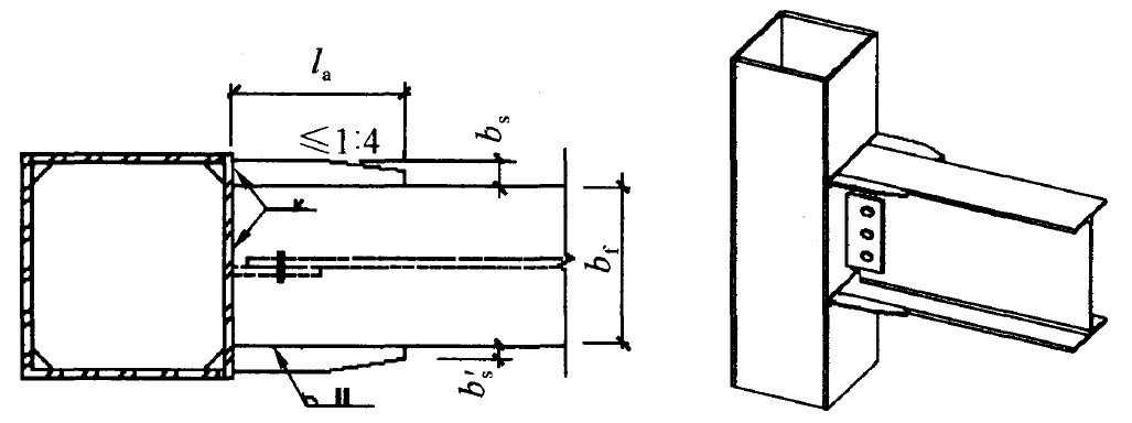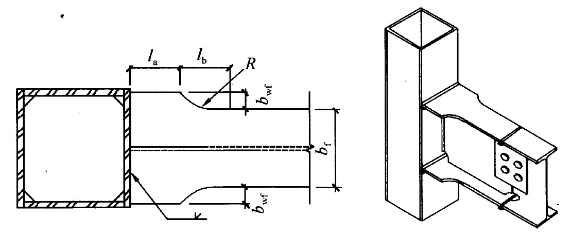 除上述方式外,另一類保證梁柱節點延性的方法是通過削弱節點區以外的梁截面,從而使得塑性鉸出現在鋼梁上,如狗骨式節點。這種狗骨式連接節點的缺點是翼緣切割面加工復雜,且試驗研究發現在梁截面削弱處容易發生面外失穩。